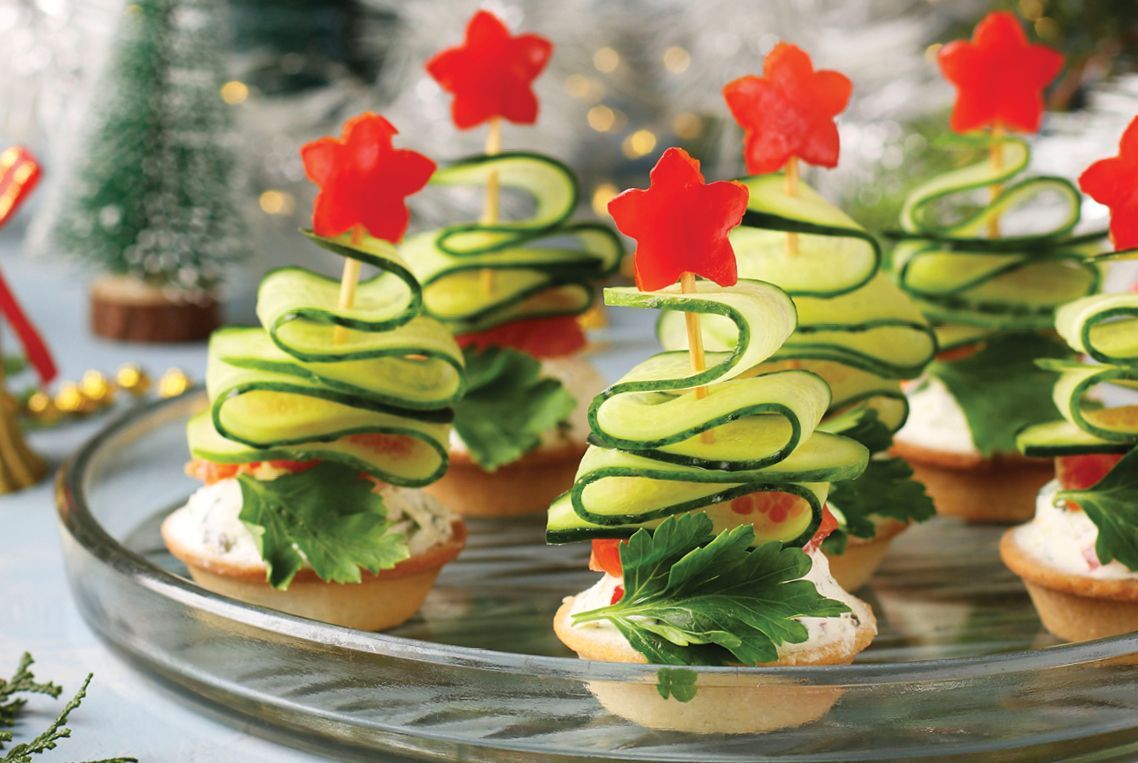 18 store-bought or homemade tart shells (baked until golden) 1 brick (250 g) cream cheese, softened 1 Tbsp. YGY Easy Eats™ Roasted Garlic Aioli Seasoning ¼ cup mayonnaise 1 English cucumber 1 red pepper for garnish