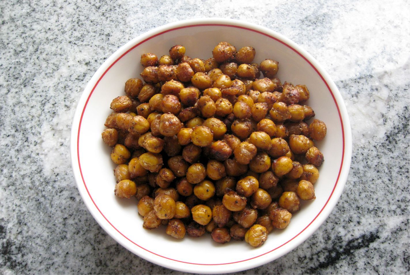 Preheat oven to 425°F. Drain the can of garbanzo beans in a strainer and rinse with water for a few seconds. Shake and tap the strainer to remove excess water, then blot with paper towel. Place oil, beans and seasonings in a plastic bag and shake to coat. Spread evenly on a baking sheet and roast 30-40 minutes until the beans are a deep golden brown and crunchy. To make sure that the beans do not burn, stir occasionally.