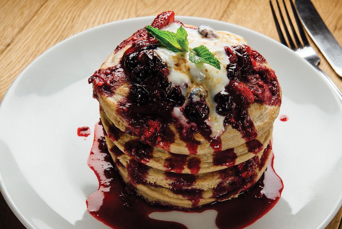 COTTAGE CHEESE PANCAKES SERVED WITH BLACKBERRY LEMON AMARETTO FRUIT TOPPING
